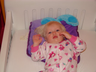 Well Ellie's crib was recalled so we decided to borrow a toddler bed from Sadie and see if she will sleep in it so we dont have to buy a new crib til we have another baby (if we are ever blessed again). Well we took down her old bed tonight and set up her room for the new bed. she liked being able to get on and off it. Well at first when it was time to lay down she cried and got up. we let her play 10 minutes longer and then she was crabby so I laid her down and she was out. However the night is still young. We will see how she does all night and what she does in the morning.